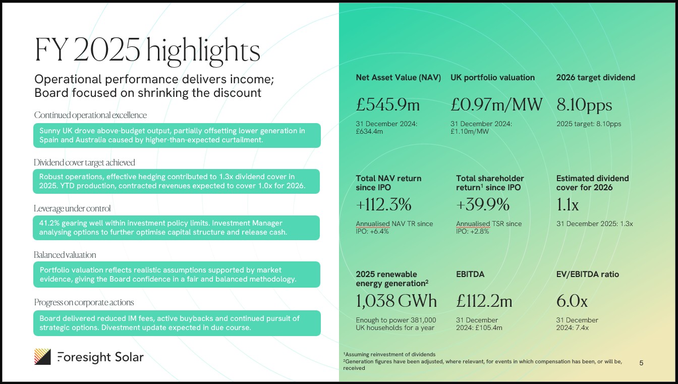 In a video for investors, Toby Virno, our fund manager, explained Foresight Solar’s continues to do what matters most: deliver dependable operational performance – despite a challenging market backdrop. Yield is a key component of the company’s appeal to shareholders, and the board and the investment manager are committed to delivering on FSFL’s income and growth strategy.